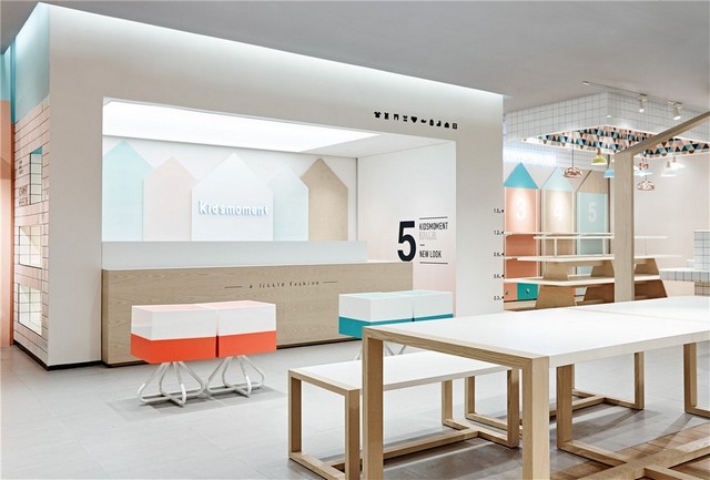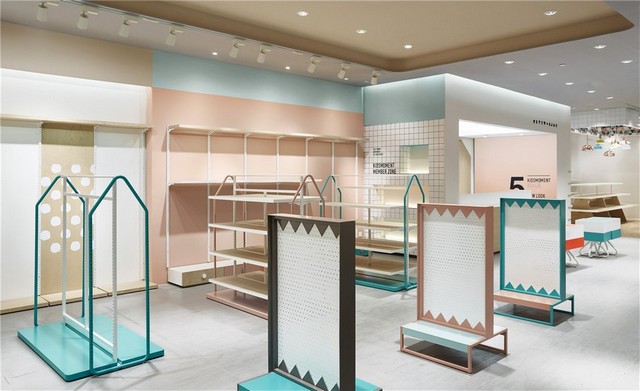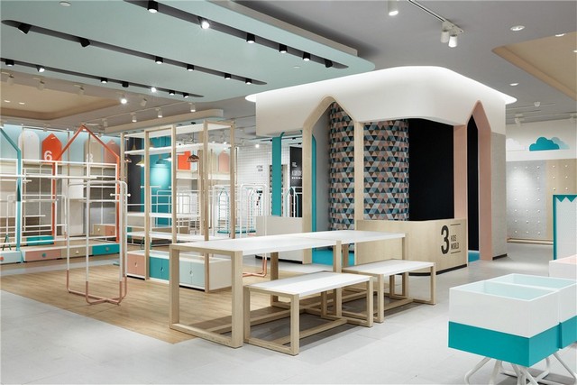 It is necessary for a designer to observe the lifestyle and needs of people and to sense the change of the trends. At the very beginning of kids moment project, RIGI did a number of researches of children fashion. Different from adult fashion, the fact is that the behaviour of children clothes shopping is controlled by parents. From this point of view, it could say the children fashion business is built on a kind of social relationship. Designer thus developed a keyword of this project, which is trust. The idea is delivering a clean, pure and joyful space, a trusting atmosphere. By increasing the display efficiency and controlling the materials and colour, create an attractive retail space with a home feeling.