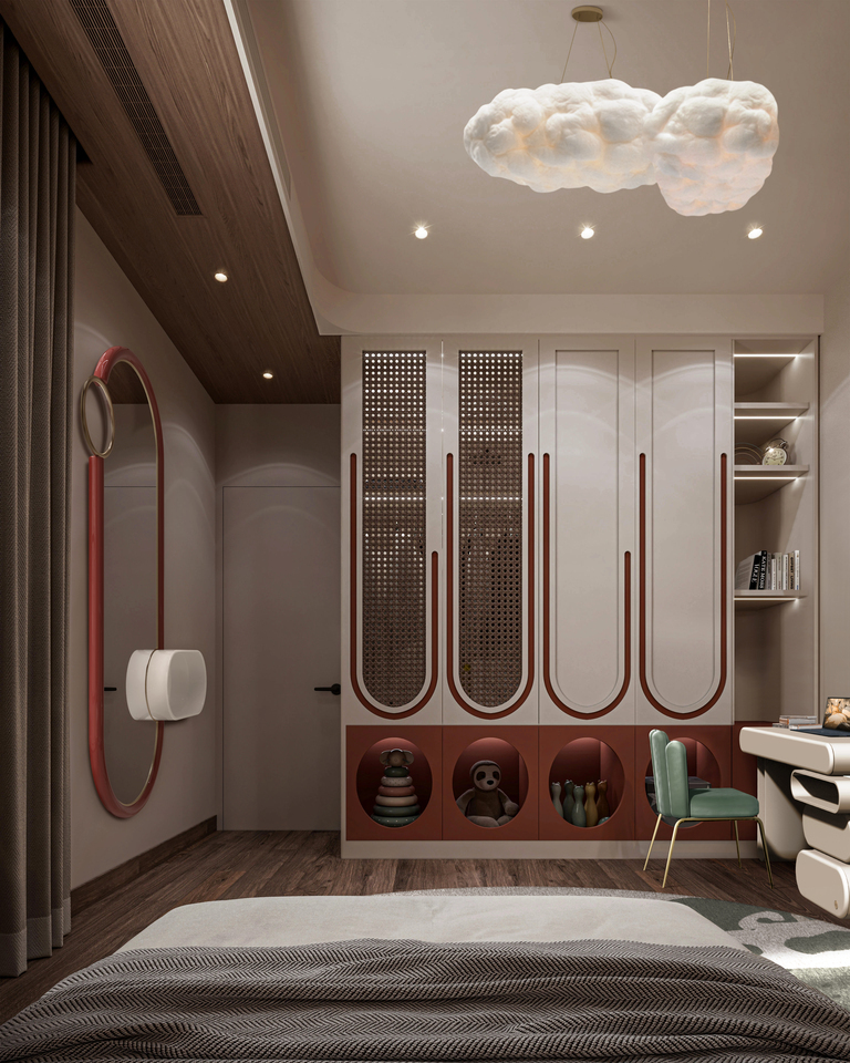Natural textures and rounded forms appear throughout the design, echoing the organic language of the jungle theme. From the paw-like bed bases and pebble-inspired accessories to the woven panels and arched niches, every detail invites touch, play, and curiosity. The layered lighting — from gentle recessed spots to the glowing cloud pendants — creates a warm, comforting atmosphere that easily shifts from energetic daytime play to soothing bedtime calm.