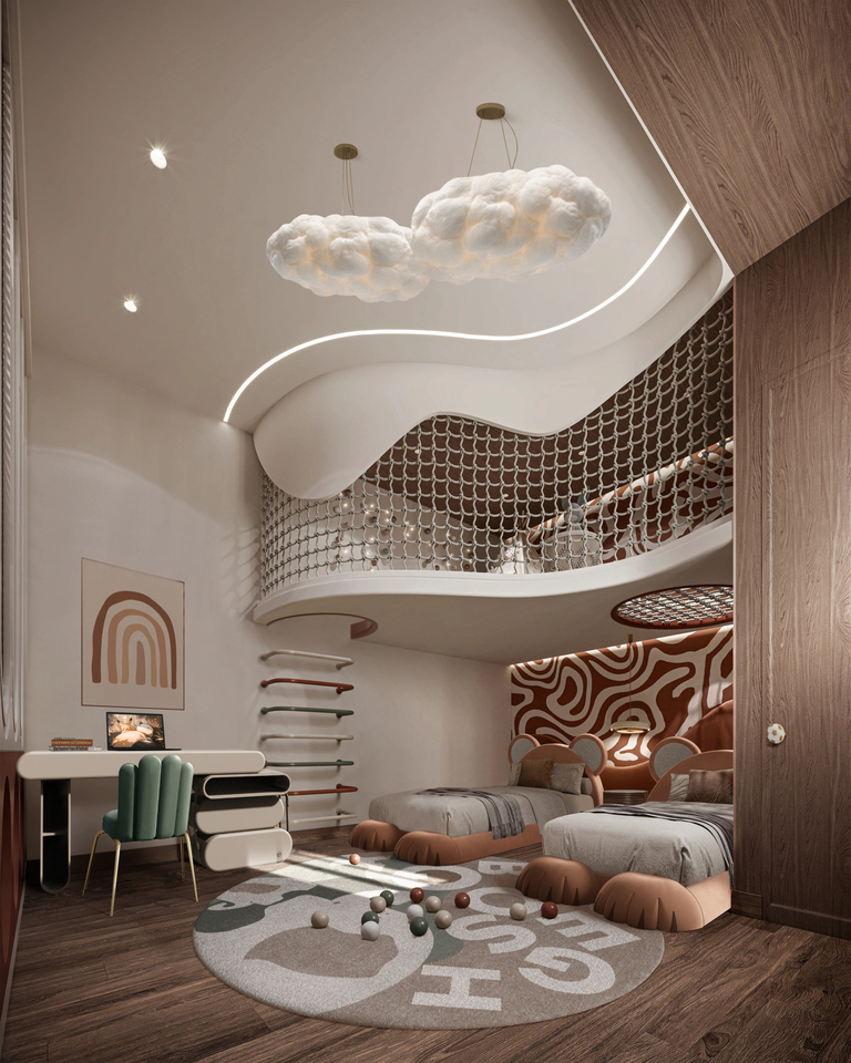 Above the main sleeping area, the flowing mezzanine adds a sense of discovery and vertical adventure, transforming the room into a miniature world with multiple landscapes to explore. The softly curved balustrade and netted safety railing create a playful yet secure boundary, allowing little ones to peer down at the activity below while feeling safely cradled in their own elevated hideaway. The sculptural ceiling lines and continuous LED ribbons guide the eye upward, reinforcing the feeling of movement and imagination that defines the entire space.