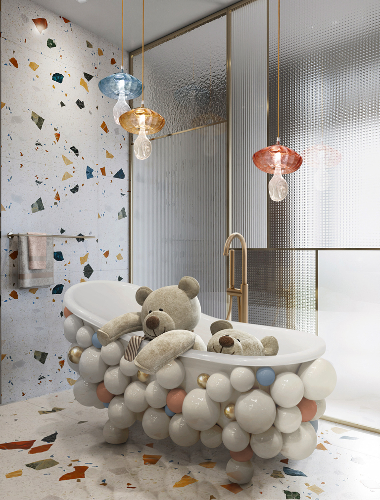 Bright and colorful stairs lead to the second floor, where the Teepee Bed awaits – a cozy retreat for stories, laughter, and sleepovers. Completing this marvelous sanctuary, the en suite bathroom in shades of sky blue, blush pink, and white, lit by the Mushroom Pendant Lamp, turns daily routines into moments of fuwn.