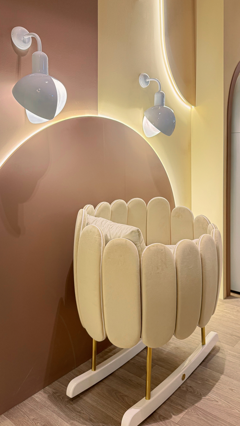 Known for transforming children’s spaces into immersive worlds of imagination, the brand arrives in Milan with a bold narrative: design is not just about function or aesthetics, it is about memory, wonder, and the quiet magic that shapes who we become. The stand itself feels like a story unfolding in real time. Gentle lighting mimics twilight, casting a golden glow over sculptural pieces that seem to belong as much to dreams as to reality. Curved silhouettes, celestial motifs, and unexpected textures create an environment that invites visitors not just to look, but to feel.